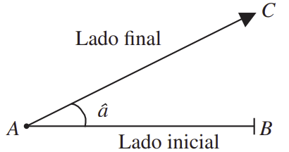 El ángulo se representa como ∠ A, ∠ BAC, â, o con letras del alfabeto griego. Si un ángulo se mide en sentido contrario al movimiento de las manecillas de un reloj, entonces es positivo, si se mide en el mismo sentido entonces será negativo.