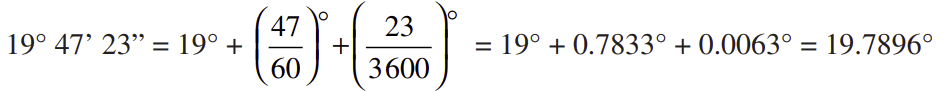 Por tanto, 19° 47’ 23” equivalen a 19.7897°